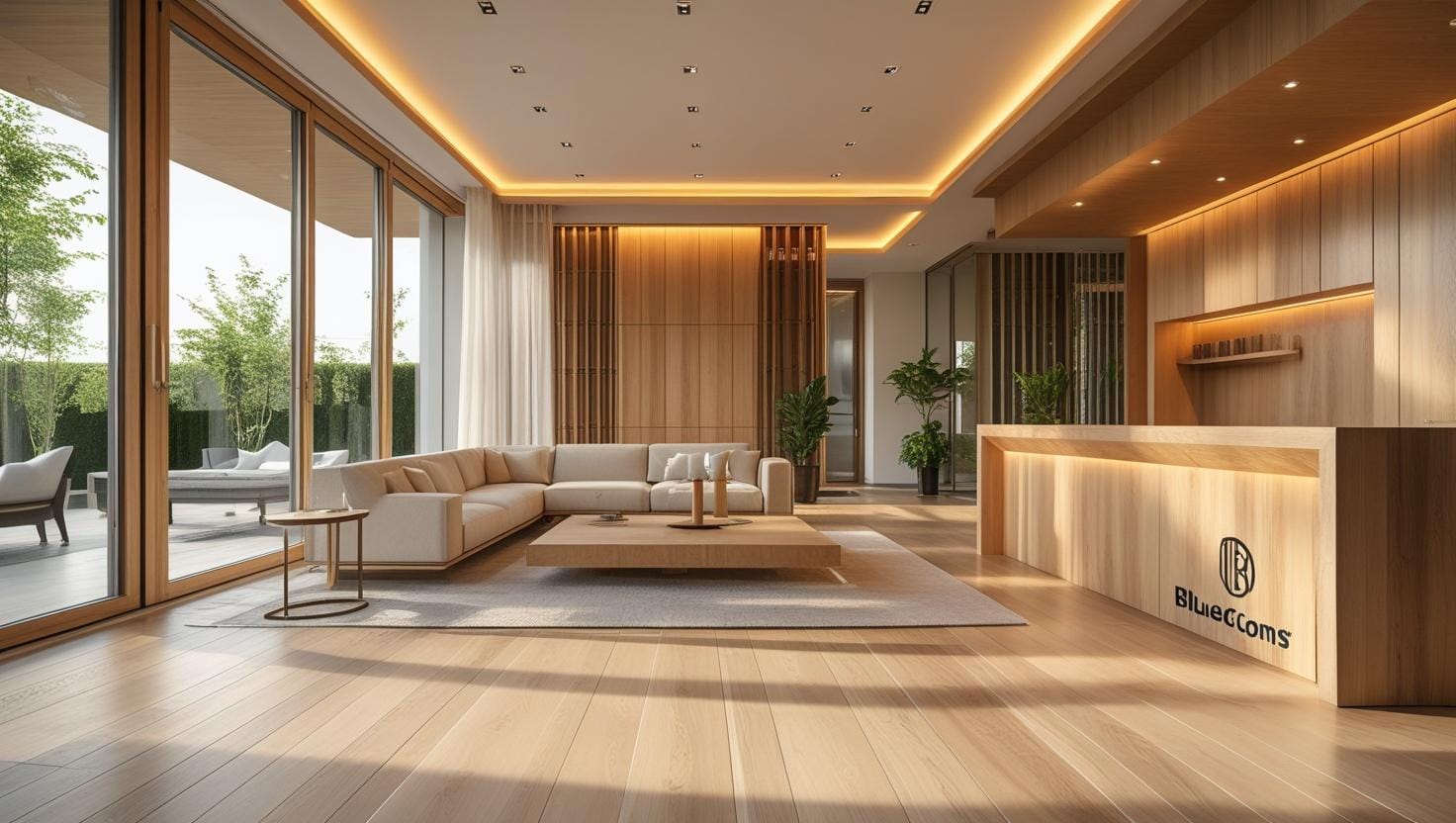 Ưu thế của BLUECONS là chuỗi khép kín: thiết kế 2D/3D → sản xuất tại xưởng gỗ CN → lắp đặt thực tế, đảm bảo đồng bộ vật liệu – phụ kiện – tiêu chuẩn hoàn thiện.