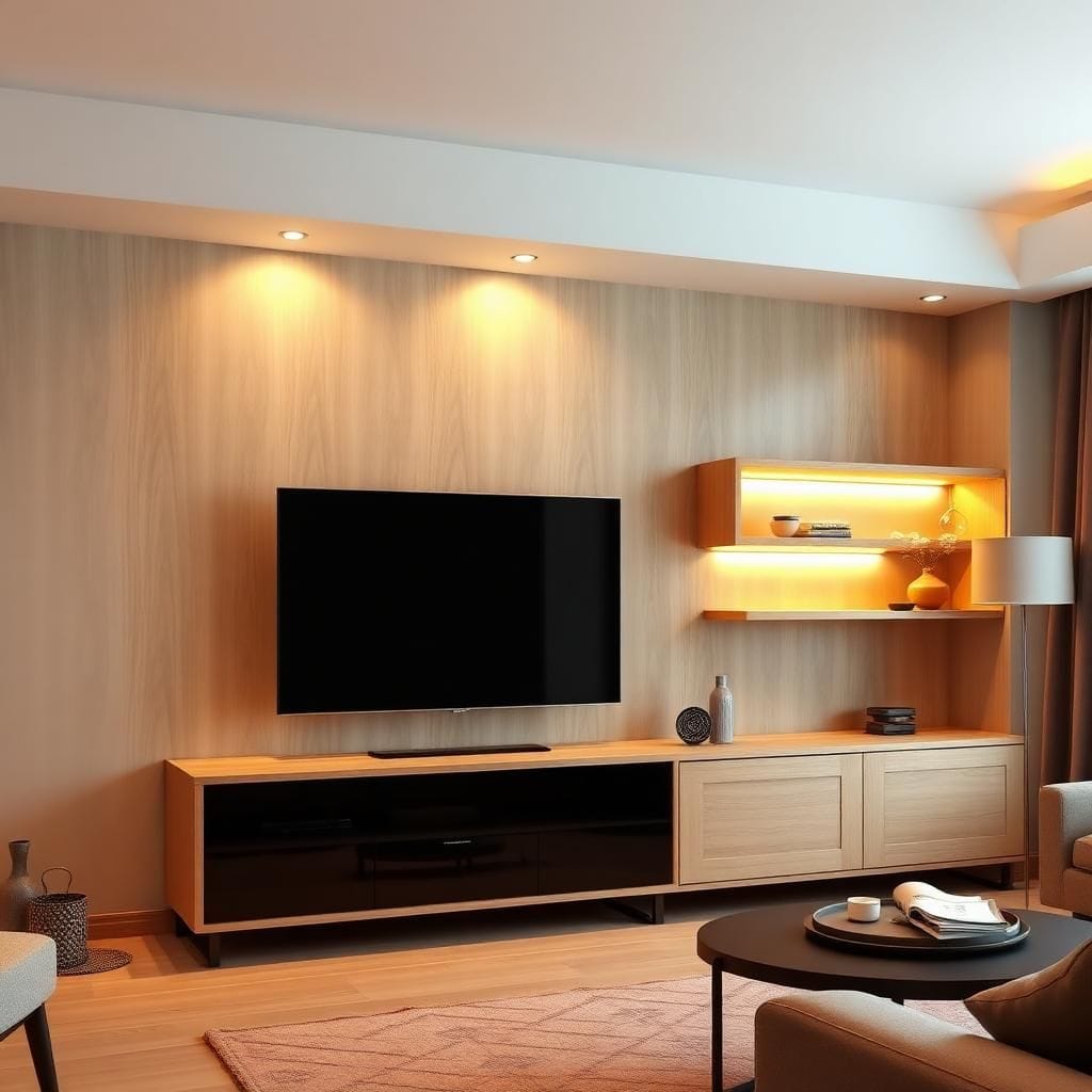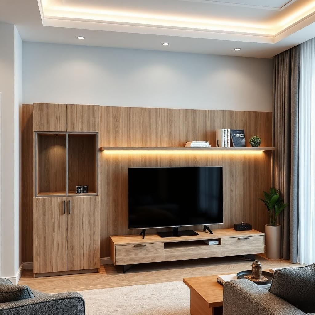 Gỗ MDF phủ Veneer hoặc Laminate chống trầy, phối LED ánh vàng ấm.