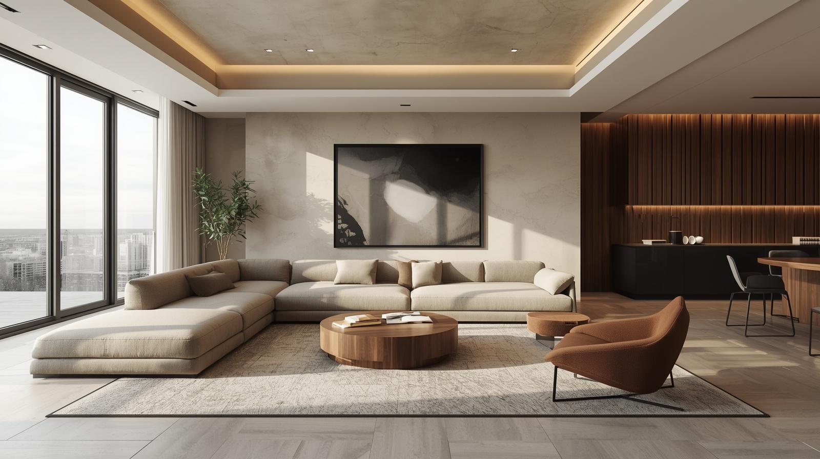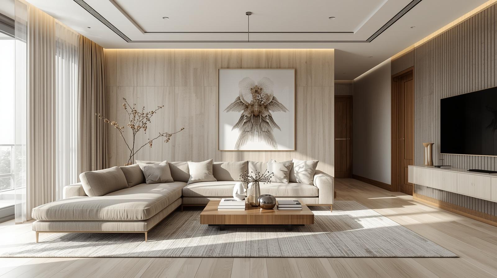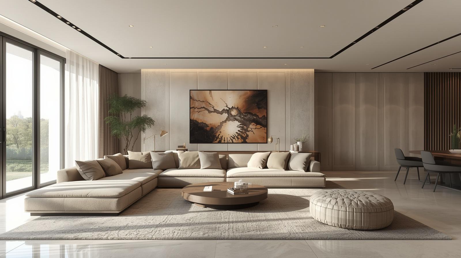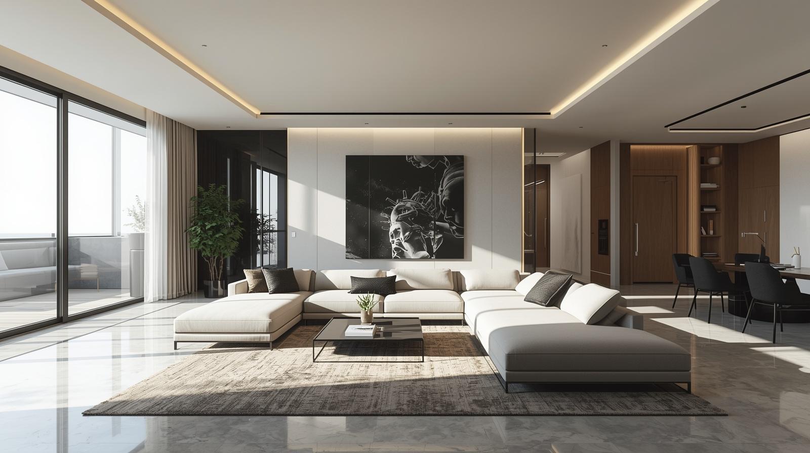 Các gam màu trung tính như trắng, xám, be luôn là lựa chọn an toàn và dễ phối. Bạn có thể tạo điểm nhấn bằng các màu đậm hơn thông qua gối sofa, tranh treo tường hoặc thảm trải sàn.