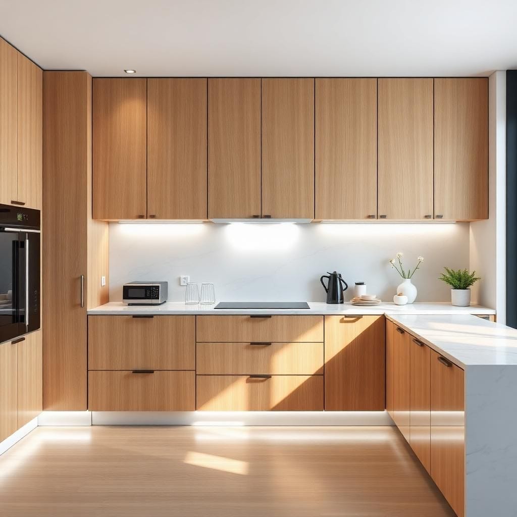 Sử dụng cùng hệ màu, vân gỗ và tay nắm để tạo tính liên kết.