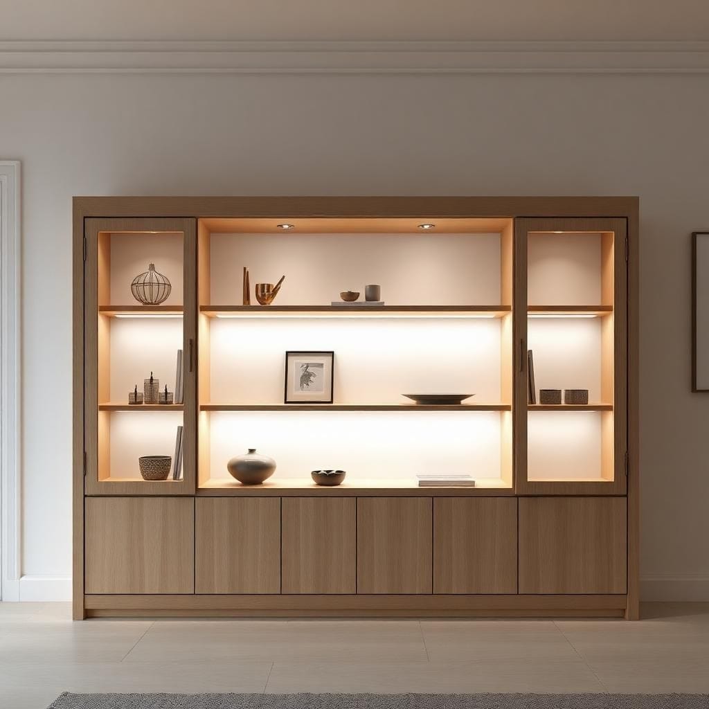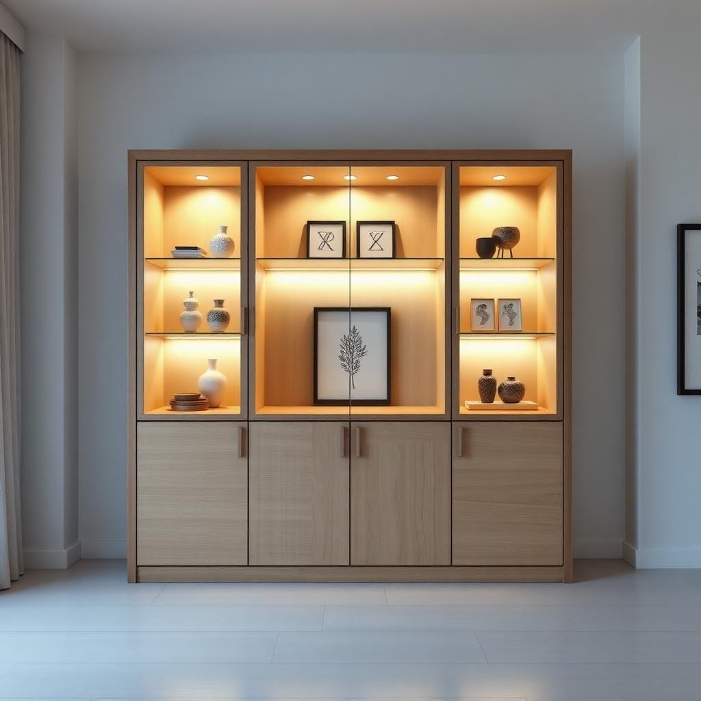 Tủ trưng bày MDF kết hợp kính và đèn LED.