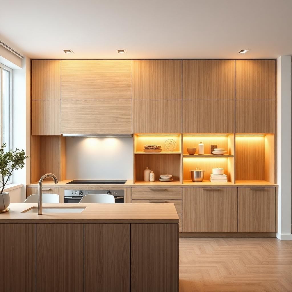 Đặc điểm: đồng bộ vân gỗ sồi sáng, phong cách Bắc Âu hiện đại.