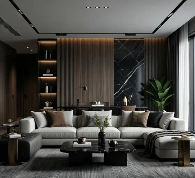 Ngoài ra, màu sắc thường là các tông trung tính như trắng, xám, be, kết hợp với điểm nhấn màu đậm để tạo chiều sâu cho không gian.