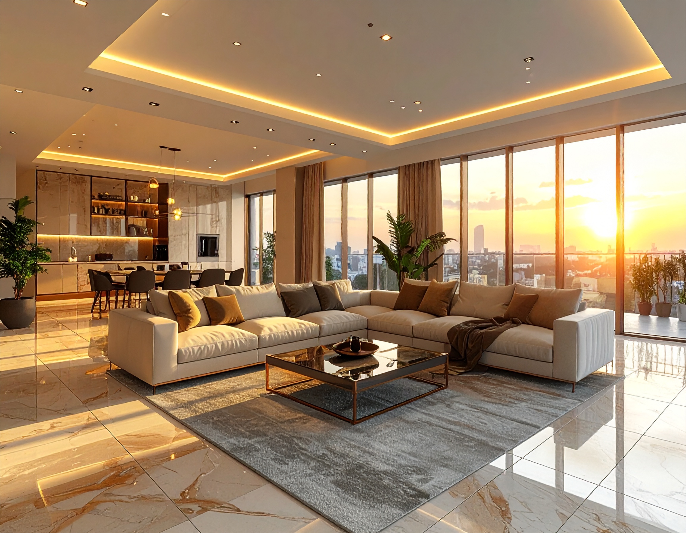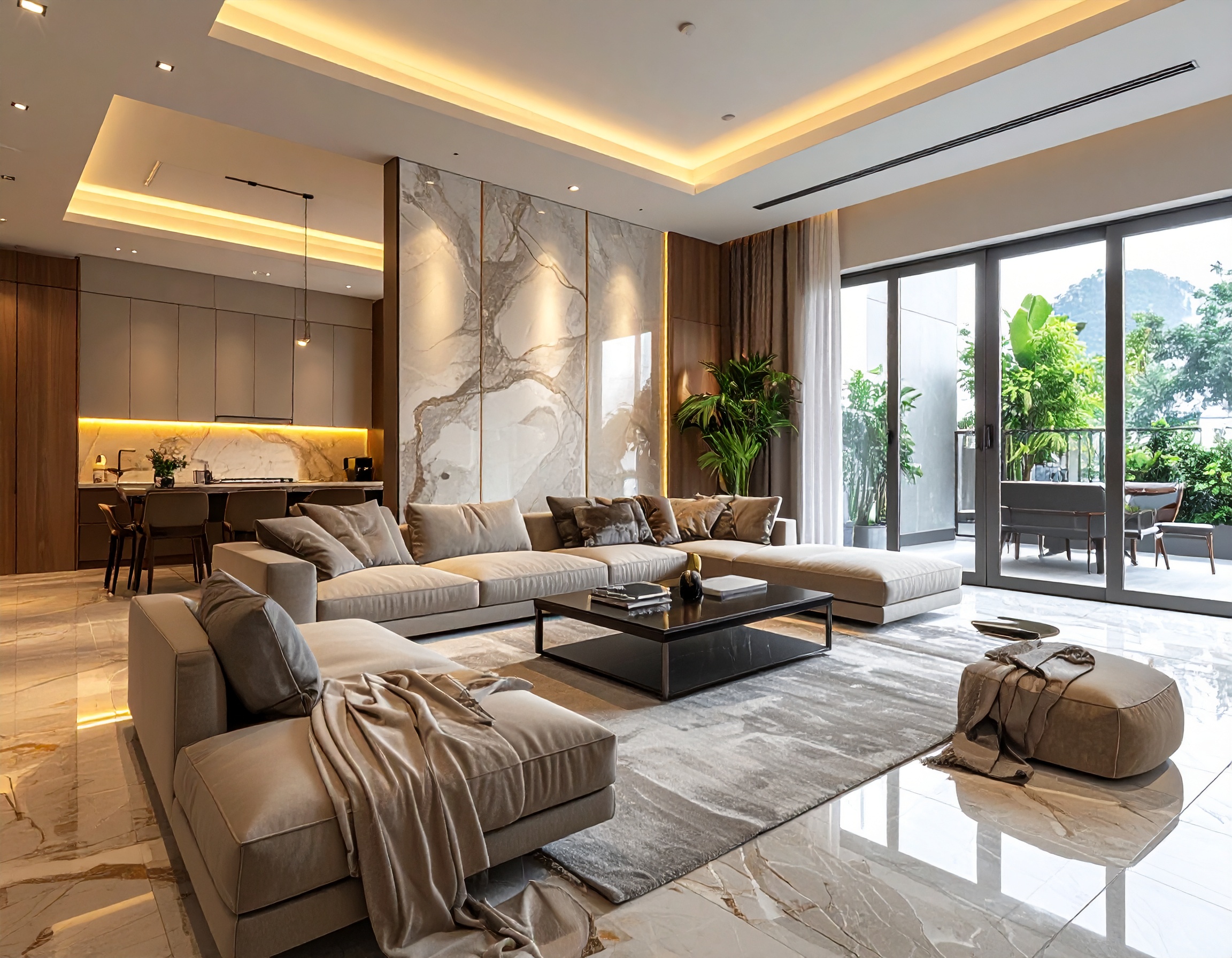 - Không gian mở: Kết hợp phòng khách, bếp và phòng ăn tạo sự đồng bộ, thoáng đãng và hiện đại.