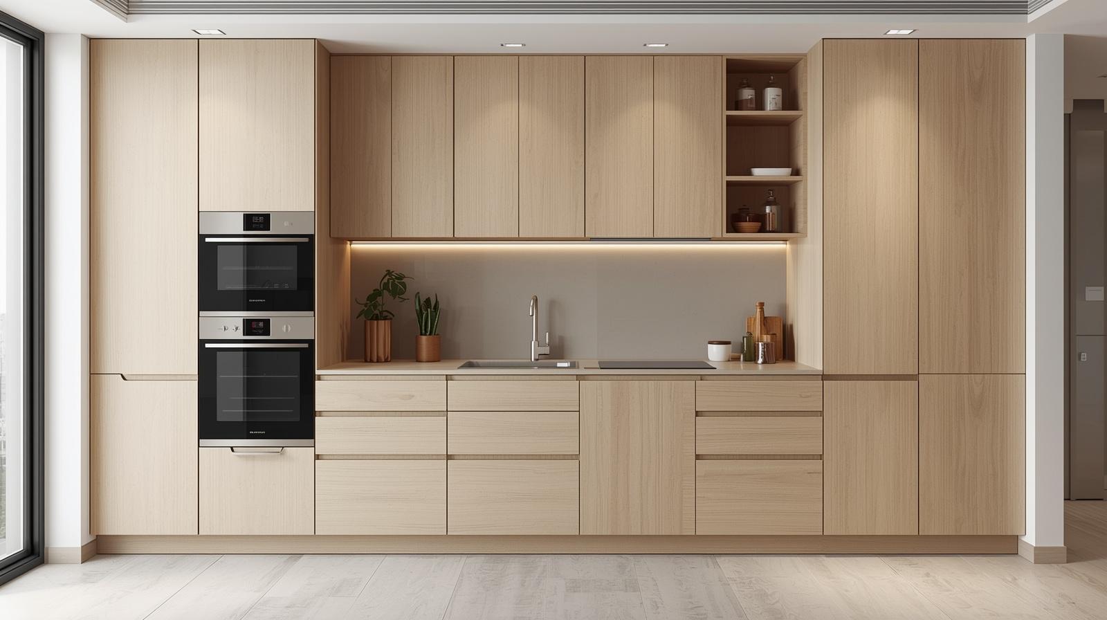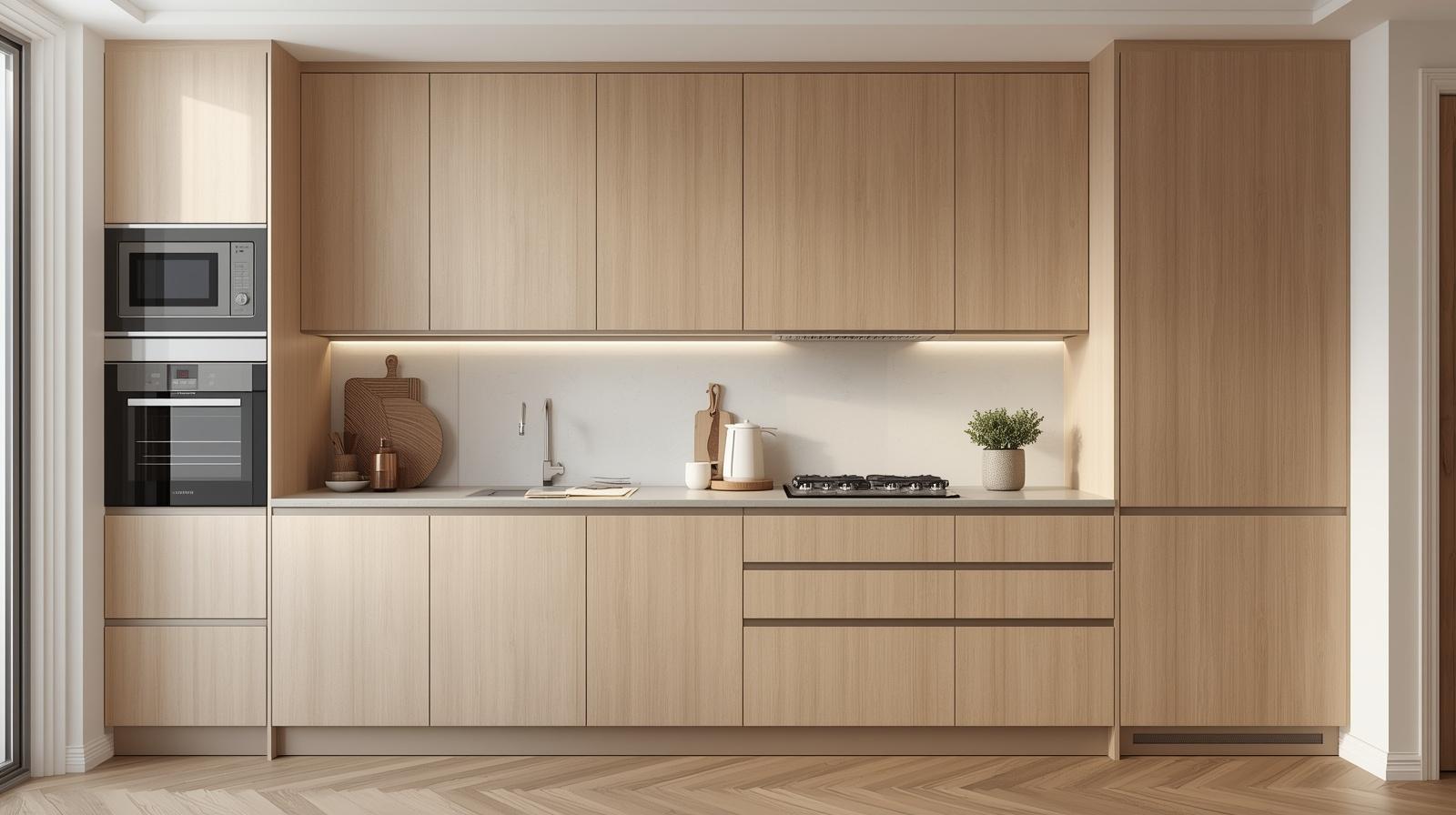 - Vật liệu tủ bếp cao cấp: Gỗ MDF chống ẩm, veneer tự nhiên, hoặc gỗ công nghiệp phủ laminate giúp bền đẹp và chống trầy xước.