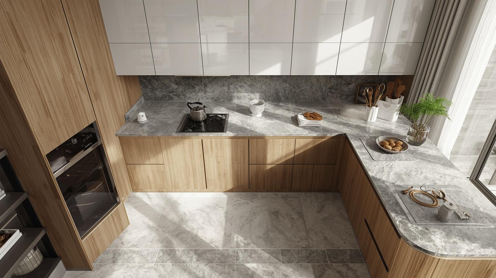 - Mặt bàn bếp đá tự nhiên hoặc nhân tạo: Granite, quartz chống thấm nước, dễ vệ sinh, chịu nhiệt và bảo đảm thẩm mỹ lâu dài.