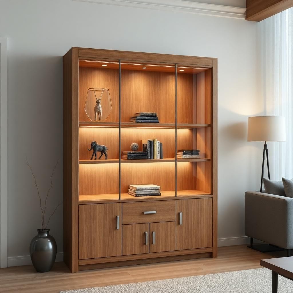 MDF + kính + Laminate, tích hợp LED chiếu sáng.