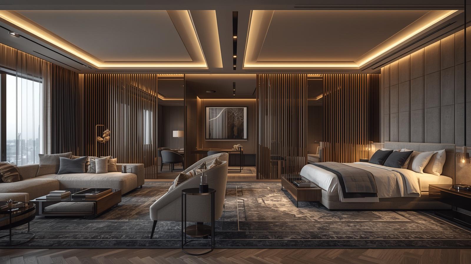 - Màu sắc: Gam trung tính kết hợp chi tiết màu vàng, nâu gỗ hoặc bạc, tạo sự thanh lịch, cân đối và quyền quý.