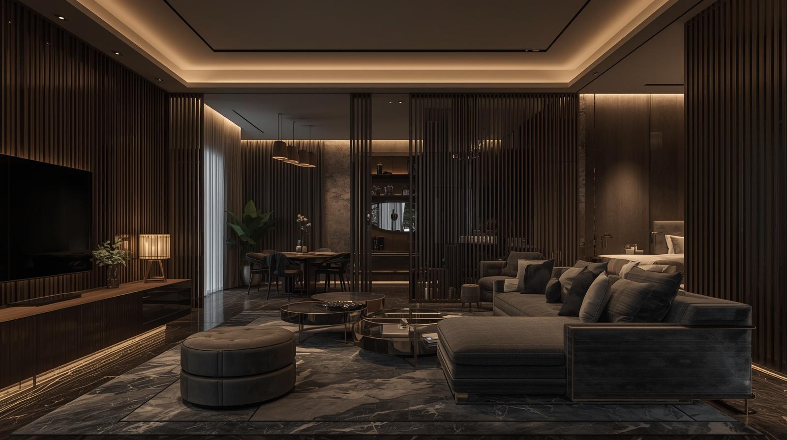 - Vật liệu cao cấp và bền bỉ: Gỗ tự nhiên, đá Marble, kính cường lực, kim loại mạ vàng và nội thất bọc da, vải cao cấp.