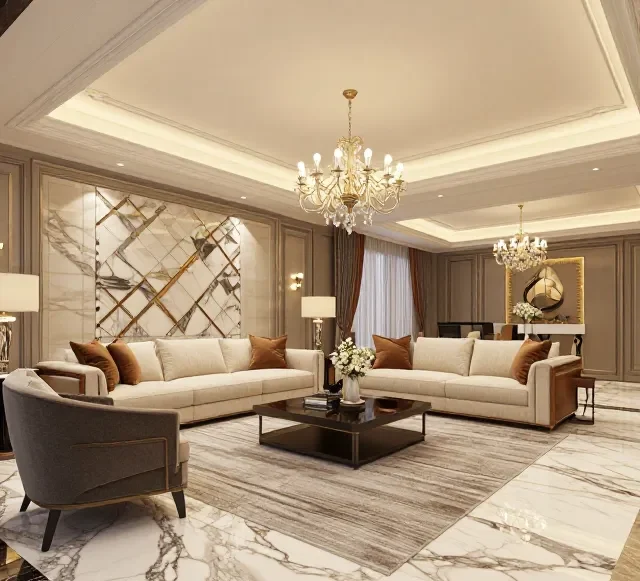 - Phòng khách: Kệ TV, sofa, bàn trà, tủ trang trí, vách ngăn tạo điểm nhấn.