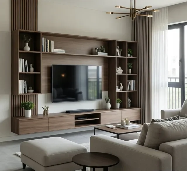 Gỗ công nghiệp MDF chống ẩm được sử dụng phổ biến trong các hạng mục như kệ tivi, tủ trang trí. Đối với không gian cao cấp, gỗ tự nhiên như óc chó hoặc sồi thường được lựa chọn để tăng tính sang trọng.