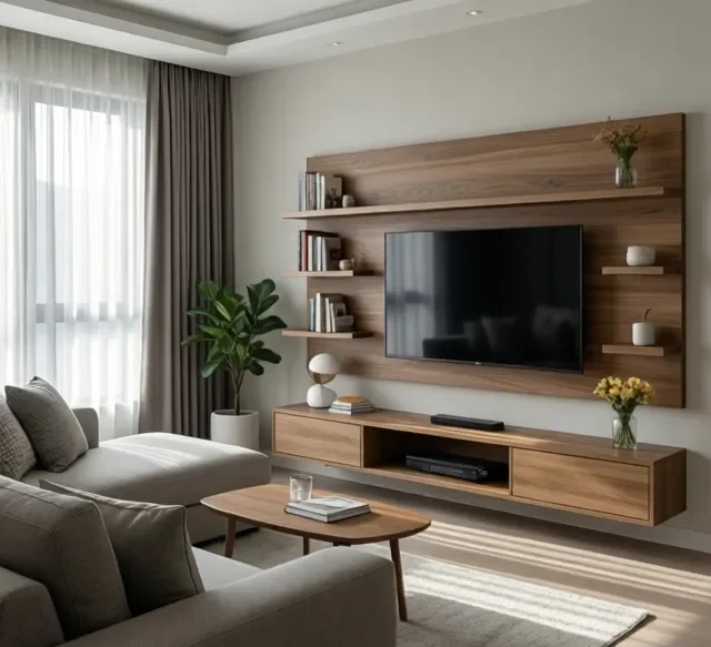 Kệ tivi và hệ tủ trang trí cần được bố trí gọn gàng, ưu tiên thiết kế âm tường hoặc treo tường để tiết kiệm diện tích.
