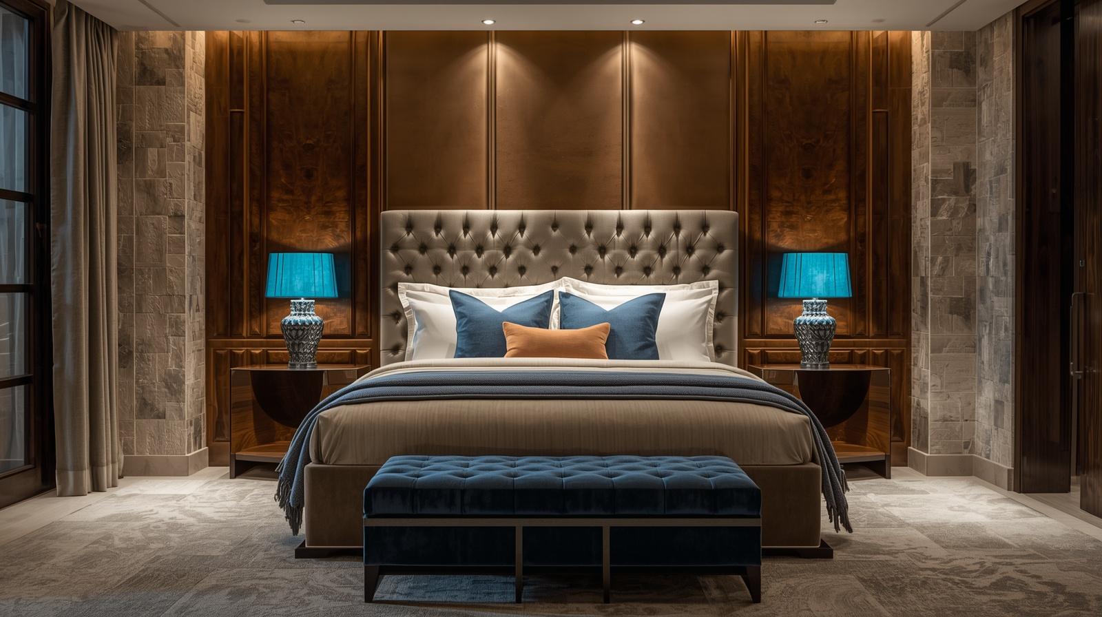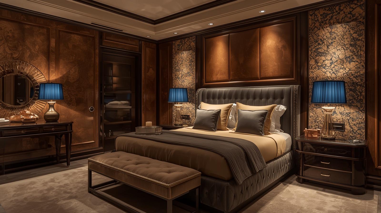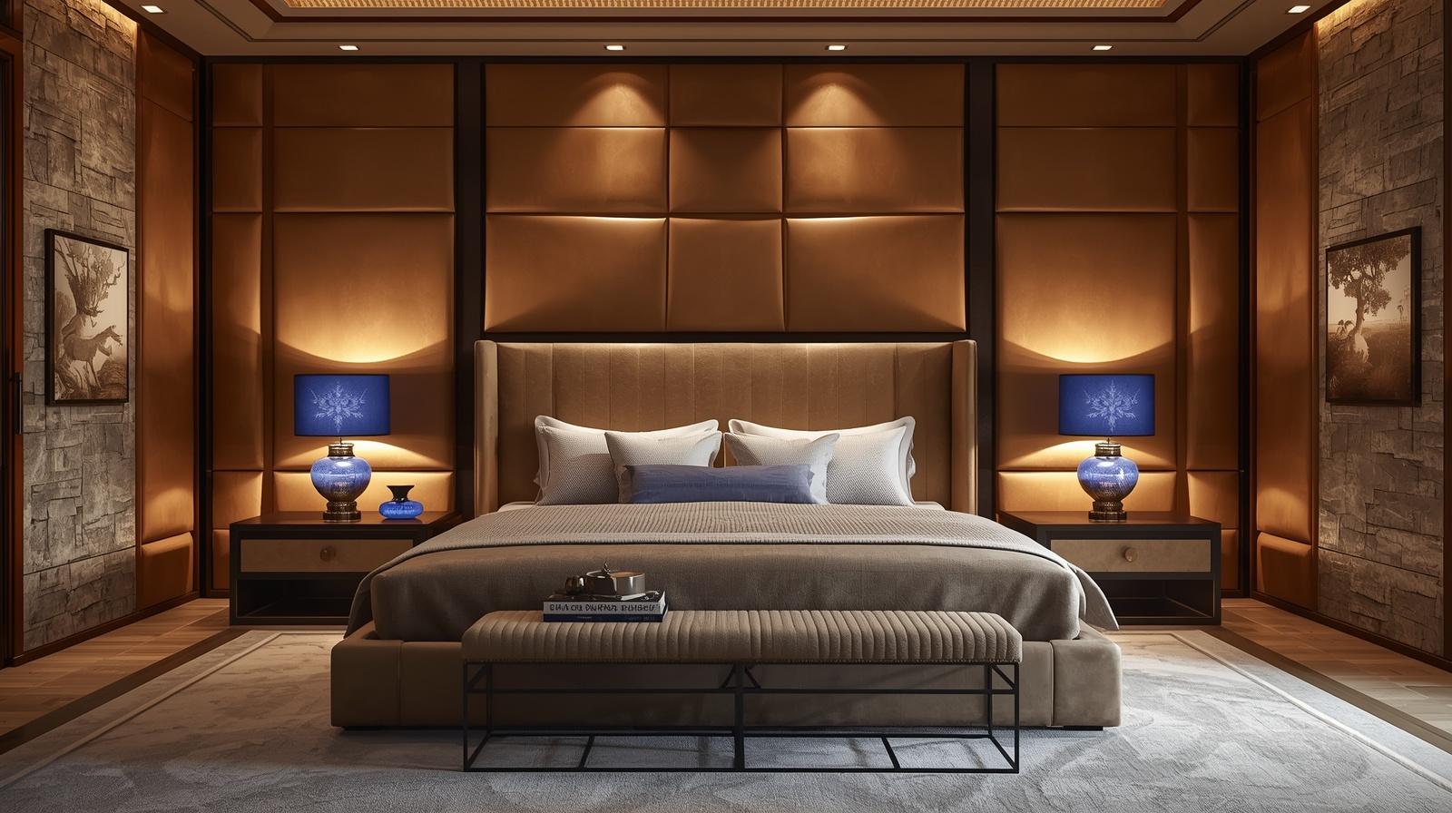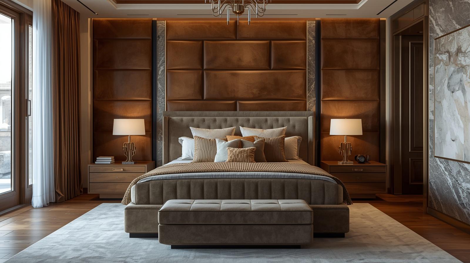 Ngoài ra, kính, vải nỉ, da công nghiệp và kim loại sơn tĩnh điện cũng được sử dụng để tạo điểm nhấn cho không gian phòng ngủ.