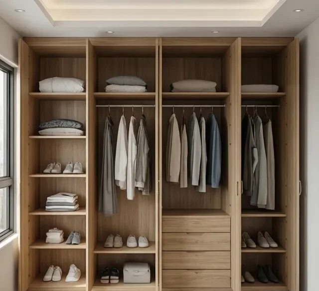- Tích hợp công năng: Ngăn kéo, kệ mở, hộc treo, kệ giày và ngăn phụ kiện, tối ưu hóa không gian lưu trữ.